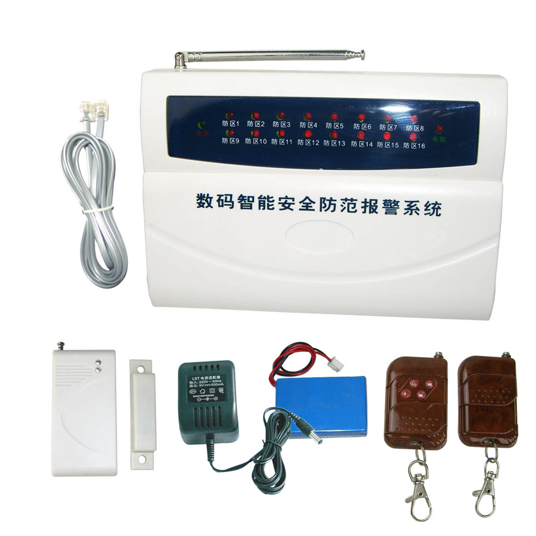 功能:16防区显示,8路有线,远程监听,各防区单独布撤防,远程控制振铃次数可选择,自带键盘密码保护, 警笛鸣响时间可选(1-30分),可延时布防 /撤防(1-99秒)自动拨打六组电话,有声或无声报警,电话线防剪,现场监听,远程控制,内置警号, 无线警号远程同步布撤防,电话抢线报警,信息断电保护,可学5个遥控,16个无线配件,带锂电.