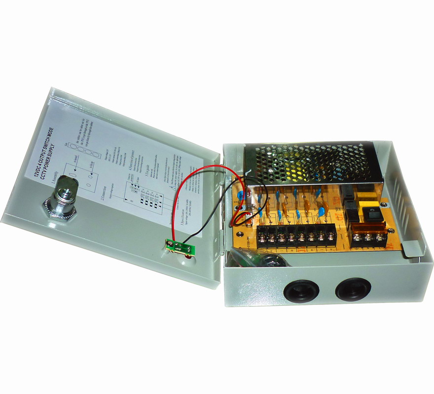 Integrated CCTV power supply box input:100-240V output:DC12V 3A 4 channel PTC smart fuse protection with automatic recovery function LED indicator in the metal box; Keylock make the metal box more safe; inner AC screw connector;