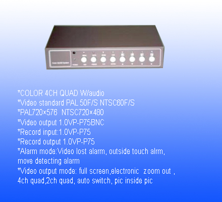 COLOR 4CH QUAD W/audio SIZE:210MM×150MM×43MM Video standard:PAL制50F/S NTSC60F/S PAL720×576 NTSC720×480 Video output:1.0VP-P75BNC Record input:1.0VP-P75 Record output:1.0VP-P75 Alarm mode:Video lost alarm, outside touch alrm, move detecting alarm Video output mode: full screen,electronic zoom out ,4ch quad,2ch quad, auto switch, pic inside pic Working voltage: DC12V/1A Circumstance temperature: -30℃~60℃