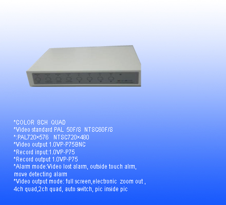 COLOR 8CH QUAD SIZE:210MM×170MM×45MM Video standard:PAL 50F/S NTSC60F/S :PAL720×576 NTSC720×480 Video output:1.0VP-P75BNC Record input:1.0VP-P75 Record output:1.0VP-P75 Alarm mode:Video lost alarm, outside touch alrm, move detecting alarm Video output mode: full screen,electronic zoom out ,4ch quad,2ch quad, auto switch, pic inside pic Working voltage: DC12V/1A Circumstance temperature: -30℃~60℃