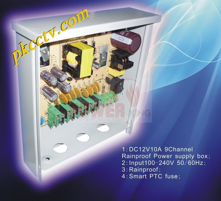Input Voltage:AC 100-240V Input Voltage:Frequency 50/60Hz Output Voltage:DC 12V Total Output Current:10A Total Outputs:9 Fuse Type:PTC (Resetable) Mains power with surge protection Internal ON/OFF switch