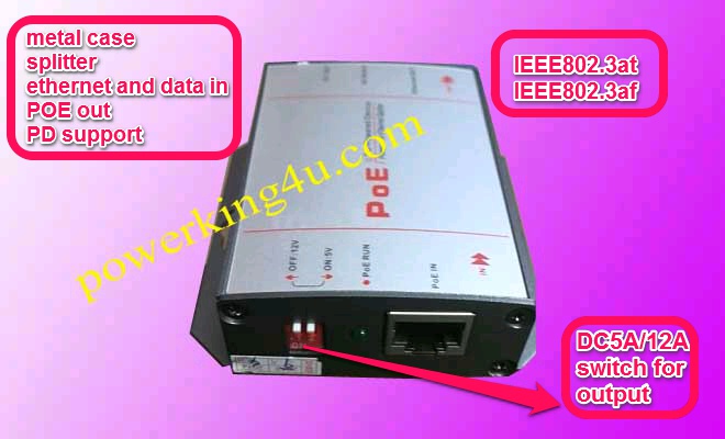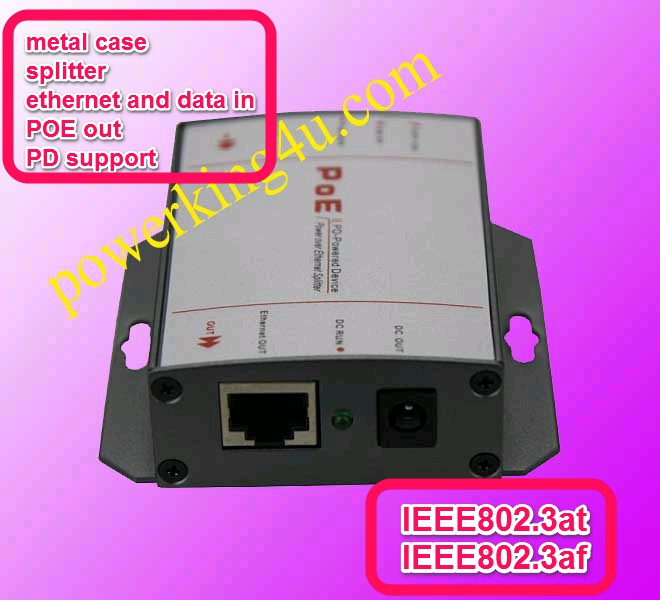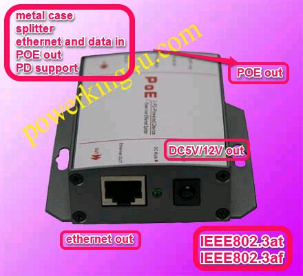 POE splitter PS009 Features IEEE 802.3af-compliant Provide 5V/12VDC optional output The maximum transmission distance is 100 meters Plug and play, no configuration Small, compact, quiet design,it is convenient to be placed on the desktop or wall