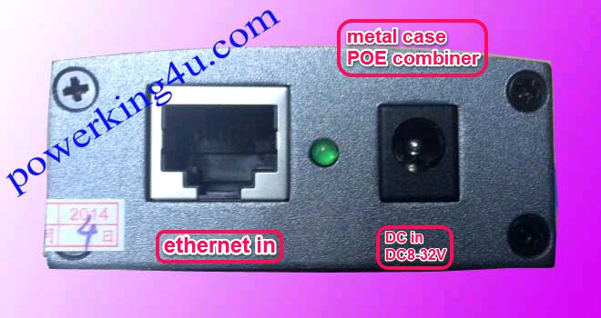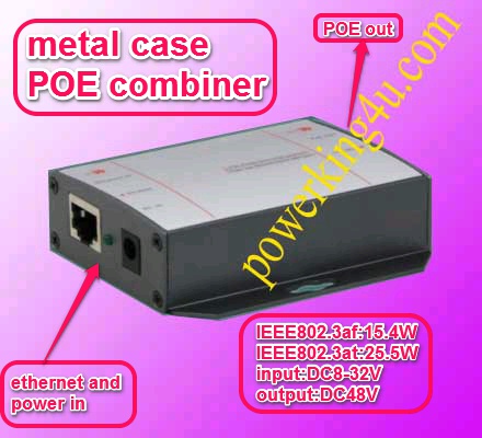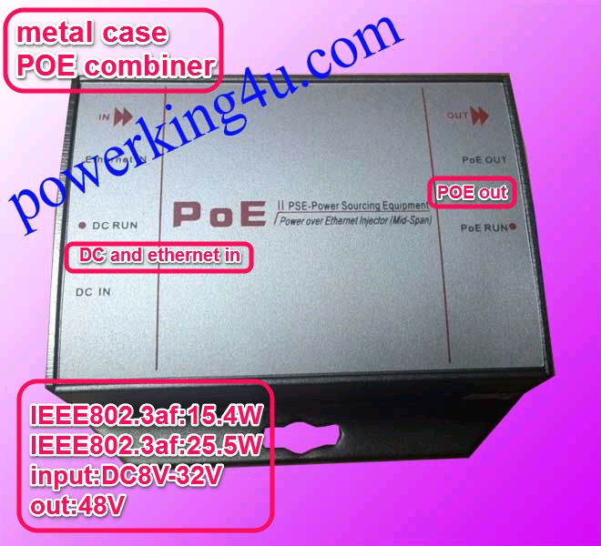 Model: combiner PC003 10 / 100M, IEEE802.3at, metal case POE Accessories Product Features * supply power for gigabit Ethernet environment high-definition network camera through Category 5 Ethernet cable; * 2 10/100 Mbps or 10/100 / Mbps RJ45 ports * Support network ports, power input port is lightning proof (meet the sencondary level lightning proof requirements) * You can use spare lines to supply power via 4/5 (+), 7/8 (-) ;or use the data line to supply power via 1/2 (+), 3/6 (-). * Support IEEE802.3at International Standard * Single-port power comsumption is 25.5W * No fans, natural cooling; small, compact and quiet design is convenient to place on the desktop or wall;