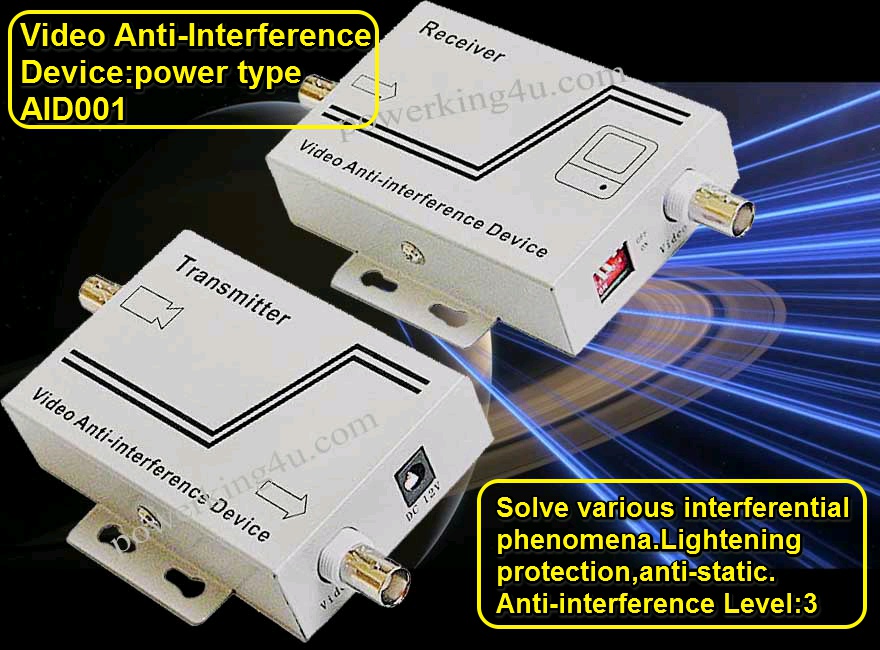 This power-type video anti-interference device is a kind of transmission electronic product which can transmit unrepeatered video image signal in an ordinary video cable for utmost 800 meters. It can solve various interferential phenomena such as power frequency, common mode and overlapping curve, etc. therefore mostly applied in weak interaction environment. This device can also provide lightening protection and anti-static function.