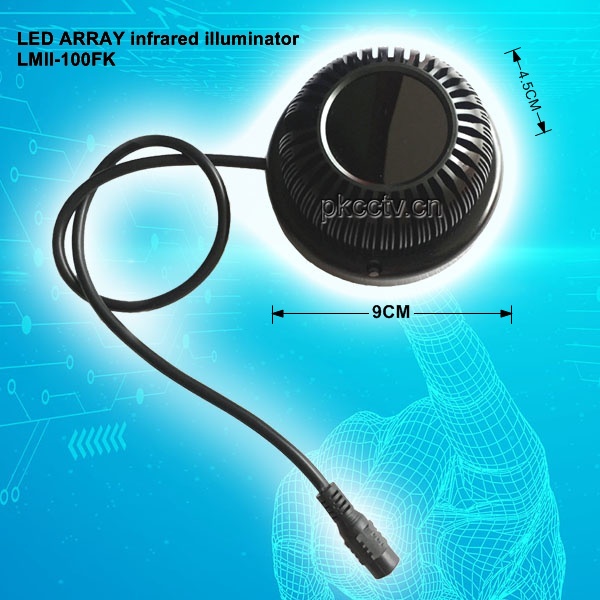 3.5 "Semi-spherical infrared light source, infrared power 5000mW/850nm, 50-160 square meters infrared range, indoor type, power consumption 10W, power supply:DC12V/2A, 140 degrees divergence angle.