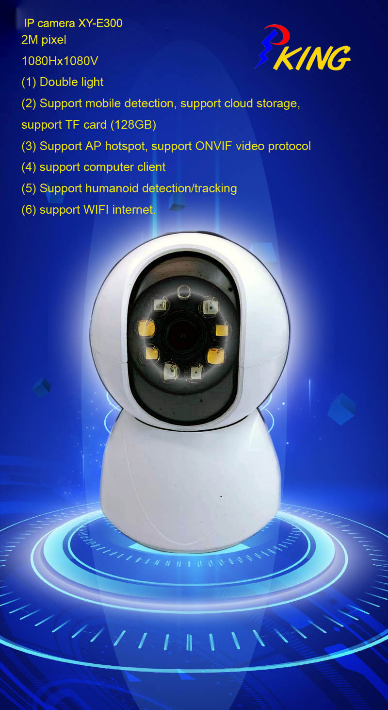 IP camera XY-E300 2M pixel 1080Hx1080V (1) Double light (2) Support mobile detection, support cloud storage, support TF card (128GB) (3) Support AP hotspot, support ONVIF video protocol (4) support computer client (5) Support humanoid detection/tracking (6) support WIFI internet.