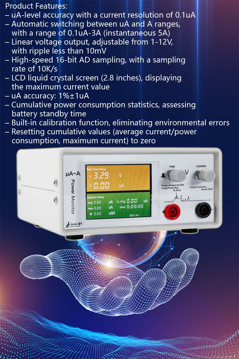 – Automatic switching between uA and A ranges, with a range of 0.1uA-3A (instantaneous 5A)